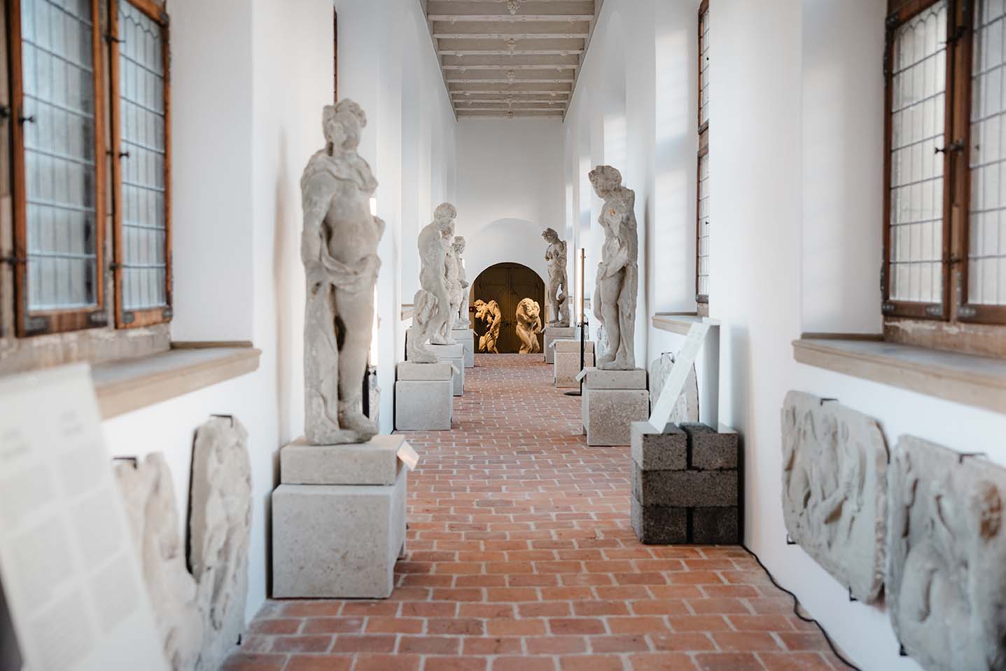 Ved ankomsten til Frederiksborg Slot passerer man en række figurer fra græsk-romersk mytologi: I ydre slotsgård står det store Neptun-springvand, på muren over voldgraven står de antikke guder i nicher, og i den inderste gård, lige over indgangen til museet, står 19 stenguder i tre overdådigt dekorerede rækker – det såkaldte Marmorgalleri.