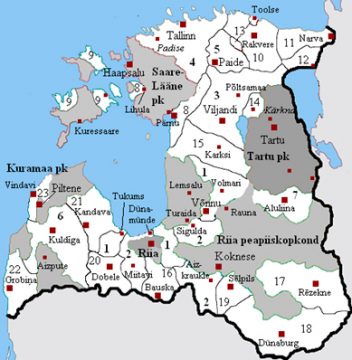 Livland i 1300-tallet. Borgen Karkus (Karsi) ligger i det sydlige Estland, lige ved nr. 15