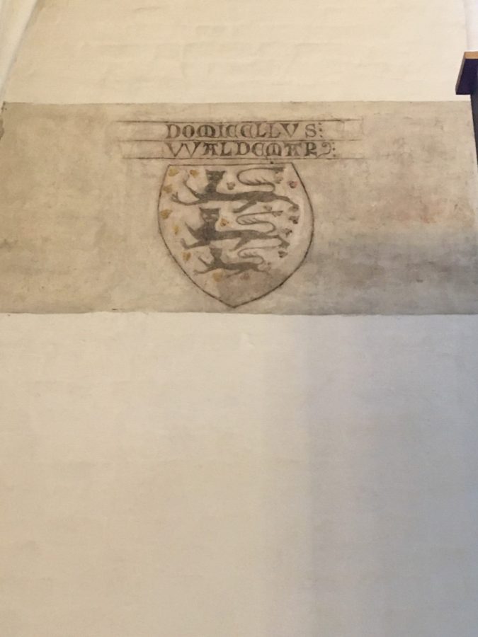 Den unge prins Valdemars våbenskjold (”Domicellus” betyder ”junker”, som i datiden var den gængse titel, som danske prinser bar.), ca. 1338. Kalkmaleri i Vor Frue kirke, Århus. Foto: Stefan Pajung.
