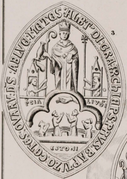 Albert Suerbeers segl som ærkebisp af Preussen, Livland og Estland. Læg mærke til, at han fremstiller sig selv som missionæren og døberen af de forskellige folkeslag i hele denne region. Illustration fra Est- und Livländische Brieflade, 4. bind, Reval, 1887.