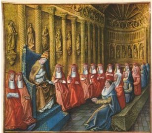 Innocens IV og hans kardinaler. Wikimedia commons.