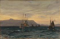 Frederik VIIIs afrejse fra Reykjavik ombord på Ø.K.s ” Birma ” ledsaget af “Alanta” med 40 rigsdagsmænd samt krydserne “Geiser” og “Hekla”