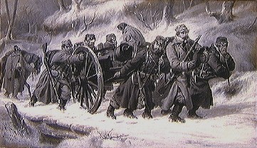 “Danske infanterister trækker en kanonlavet ved tilbagetoget fra Dannevirke stillingen 1864”
