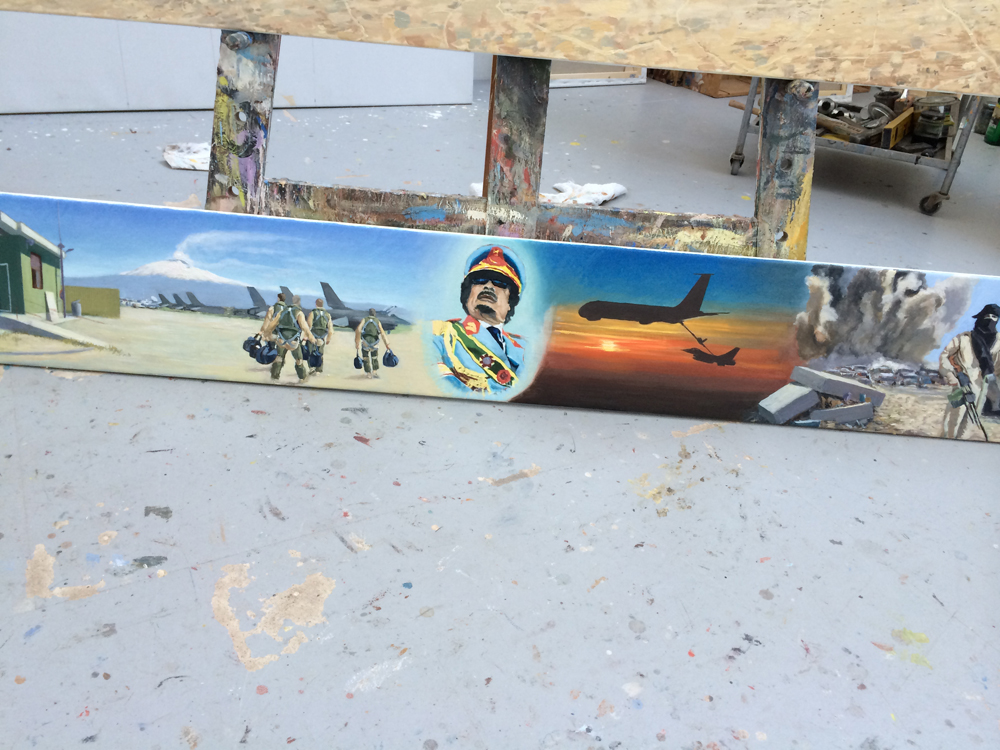 På predellaen ser man, hvis man starter helt ude til venstre, et landskab hvor huset ligesom perspektivisk peger ind i maleriet. Øjet følger de perspektiviske linjer ind imod forsvindingspunktet og bliver så ledt over i flyene og soldaterne på vej ud mod flyene. Der er en horisont, et landskab der er helt traditionelt fremstillet. Så kommer der i midten en fremstilling af konfliktens hovedperson Muammar Gadaffi, som ligesom deler billedet i to. Og for ikke at lade landskabet fortsætte ubrudt bag diktatorfremstillingen, valgte jeg at sætte en lufttankning ind, således at du kommer et andet sted hen, i retning af en rejse, en allegori… i hvert fald et symbol på, at vi flytter os i tid og sted. Det har jeg brugt denne lufttankning til, bl.a. også på grund af det visuelt interessante i farverne. Det skiller sig fuldstændig ud fra resten. Jeg har ikke haft nogen idé om at fremstille et harmonisk billede, det har aldrig stået for mig som noget ideal – det er noget, der hører til før postmodernismen – så jeg har ikke noget ideal om, at det skal være harmonisk. Det skal bare være sammenhængende og visuelt interessant, og så synes jeg, at denne lufttankning, hvor der ingen horisont er, danner et godt break med horisonten – specielt også fordi det sidste billede, jeg ville lave, var fra Libyen i dag, og der vil så naturnødvendigt komme en horisont igen. Og for at det ikke skulle blive én sammenhængende horisont, var det en kærkommen afbrydelse med sådan en lufttankning, som er sat ind som en lille pause mellem den ene og den anden horisontfremstilling.