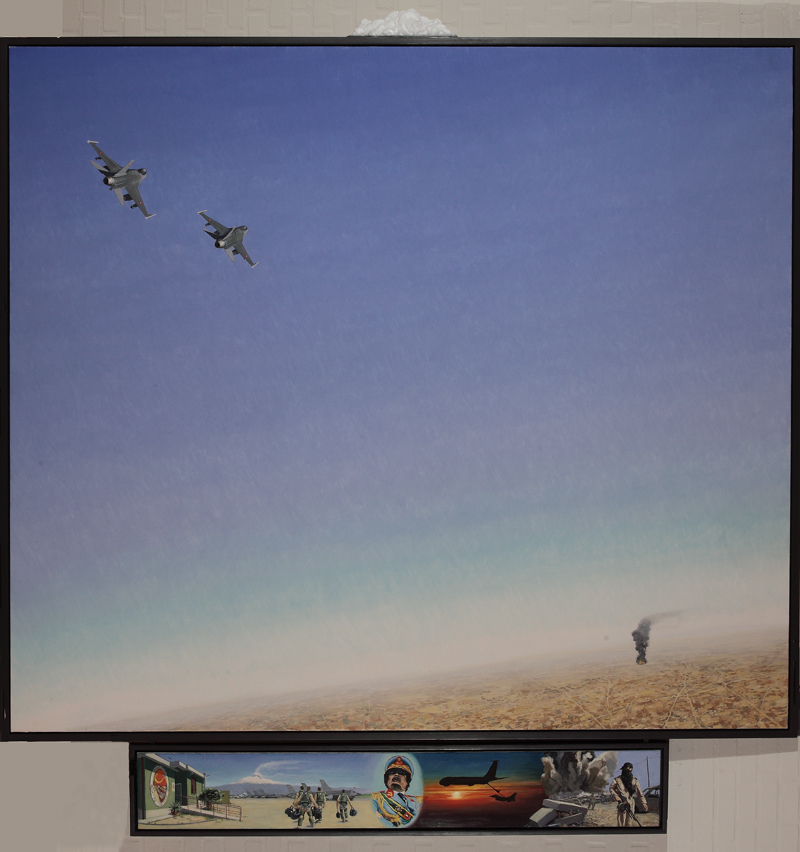 Men det der blev udslagsgivende for, hvordan billedet kom til at se ud, var for det første, at den danske indsats som jo var emnet for billedet, den foregik kun med flyvevåbenet. Så det ville ikke være nogen idé at lave noget, der foregik på jorden. Så skulle det i hvert fald have været noget, som jeg kunne forbinde direkte med den danske indsats, og eftersom indsatsen i Libyen jo var overstået flere år før – det var i 2011, og jeg har malet i 2013/14 – så havde jeg jo ingen mulighed for at se noget, der var en direkte følge af den danske indsats dernede. Så derfor tog jeg udgangspunkt i, hvor man er henne, når man sætter ind med flyvevåbnet. Og der er man oppe i luften. Derfor blev mit billede en himmel, hvorpå der flyver disse to F-16-fly, som er malet så godt, som jeg overhovedet kan male rent teknisk. To fly, hvor alle detaljer mht. farver, udformning af haleror, bemaling osv. er så tæt på, som flyene faktisk så ud, dengang de blev sat ind. Og så er der en skæv horisont, som understreger, at vi ikke har den traditionelle horisont som i et landskabsbillede, hvor man kan se en lige horisont, men her er horisonten tiltet en lille bitte smule. Hvis man er oppe at flyve i et mindre fly, der giver sig meget, vil man jo se Jorden forandre sig i forhold til, hvordan flyet ligger i luften. Det er det, jeg har forsøgt at få fremstillet ved at lave en skæv horisont, og så udforme landskabet sådan som de fotos så ud, som jeg fik stillet til rådighed, taget fra F-16-fly i Libyen.