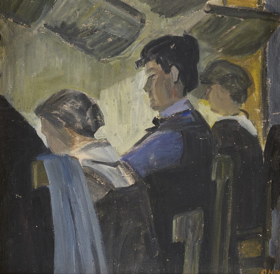 Olivia Holm-Møller har malet kvinderne på Frederiksborgs vævestue. De sidder på række foran væven og er i gang med at væve de nye gobeliner til Riddersalen. Maleriet er en nyerhvervelse i Frederiksborgs samling og kan ses på vores store udstilling GOBELIN – I TRÅD MED TIDEN sammen med fantastiske tekstilværker indlånt fra bl.a. Sverige, Norge og Tyskland: Agnes Slott-Møller, Gunnar Wennerberg, Frida Hansen, Skærbæk-skolen, William Morris osv.