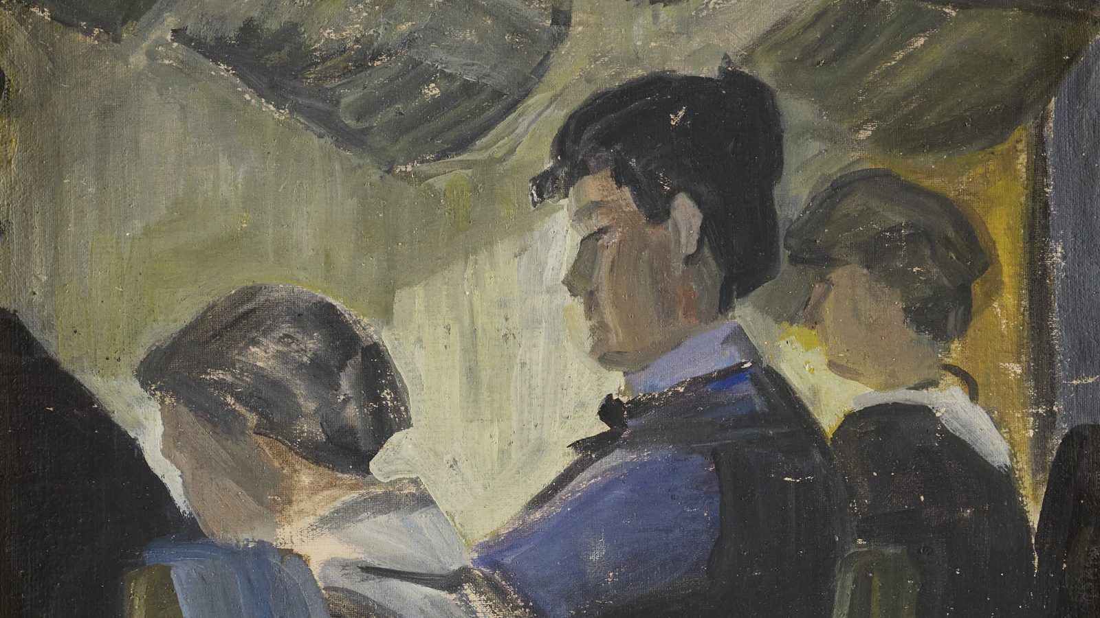 Olivia Holm-Møller har malet kvinderne på Frederiksborgs vævestue. De sidder på række foran væven og er i gang med at væve de nye gobeliner til Riddersalen. Maleriet er en nyerhvervelse i Frederiksborgs samling og kan ses på vores store udstilling GOBELIN – I TRÅD MED TIDEN sammen med fantastiske tekstilværker indlånt fra bl.a. Sverige, Norge og Tyskland: Agnes Slott-Møller, Gunnar Wennerberg, Frida Hansen, Skærbæk-skolen, William Morris osv.