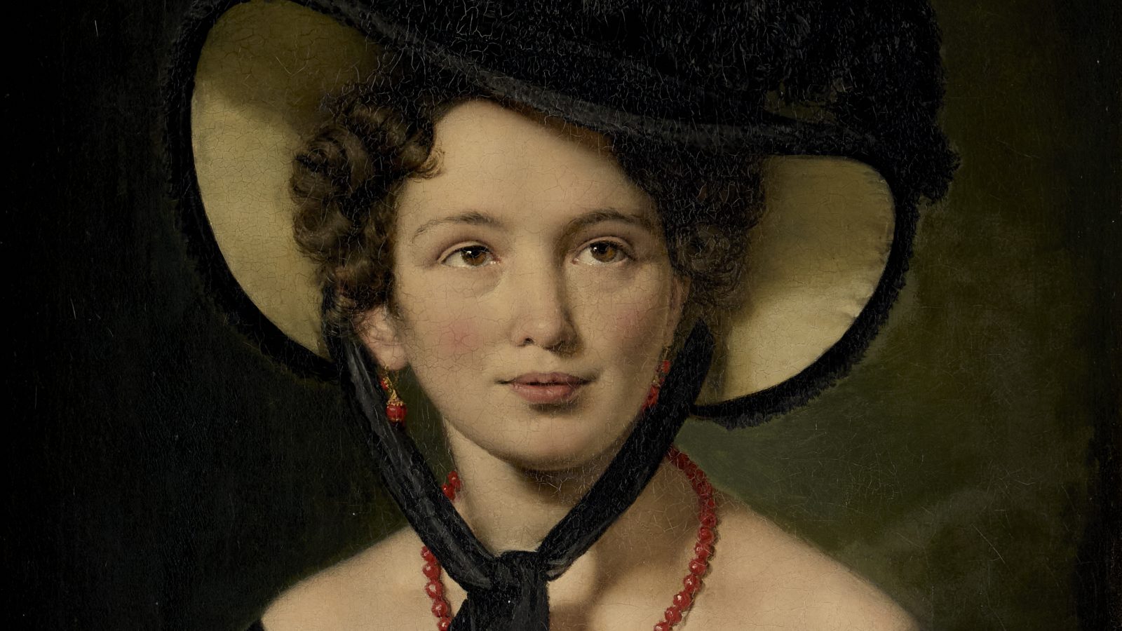 Catharina Jensen, født Lorentzen, er her malet af sin mand C.A. Jensen i 1826, tre år efter deres bryllup. Hun bærer en knitrende ravnsort silkekjole, en smuk rød koralkæde med kors og en imponerende fjerhat. Små ørenringe i koraller og guld glimter fra ørerne, men det er korset, der sammen med det betagende ansigt udgør et midtpunkt i portrættet.