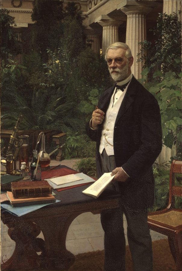 Med mig har jeg et print af August Jerndorffs helt forrygende portræt af J.C. Jacobsen fra 1886, hvor bryggeren står i sit frodige væksthus ”Pompeji” med romerske søjler og moderne arbejdsbord – mikroskop og laboratoriekolber, en flaske Gamle Carlsberg Lagerøl – og selveste Pasteurs bog om ølbrygningens videnskab.
