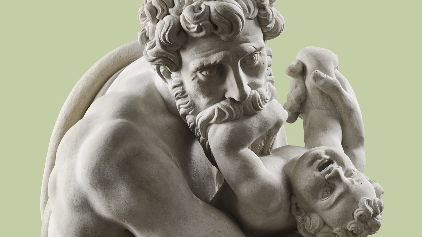 Én af guderne er Saturn, der æder sine egne børn – det berømte motiv, vi også kender fra Goyas maleri. Ham ser du her øverst på siden i helt nyhugget version.