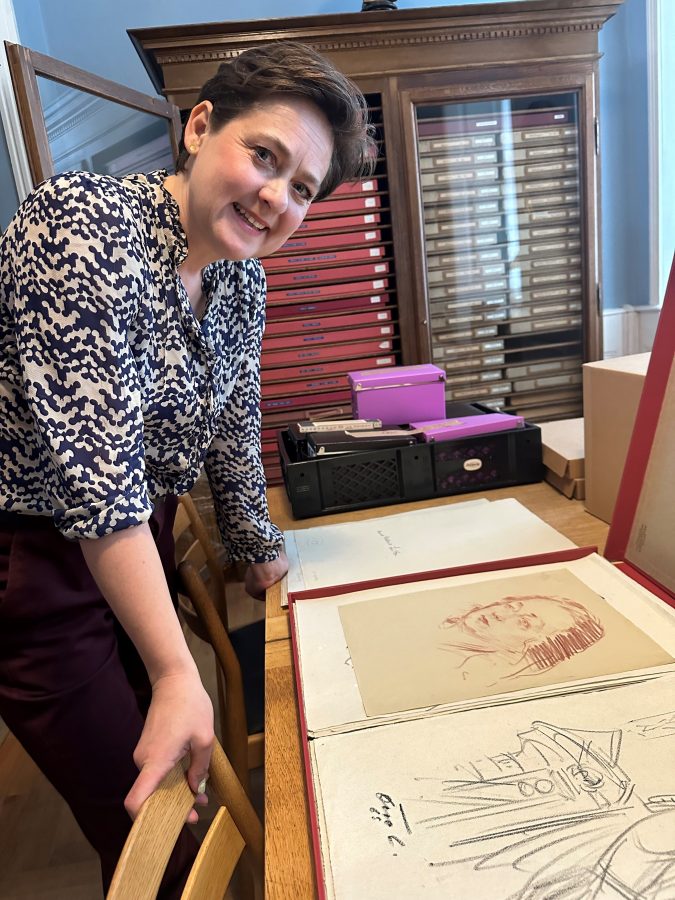 Sara Alfort har bl.a. udgivet bøgerne “Damer der var for meget” og “Damer der fik nok”. Her finder vi tegningen af Hulda Lütken frem.