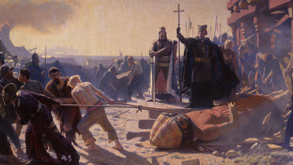 Derunder Laurits Tuxens maleri af Absalon og Valdemar, der smadrer Svantevit i Arkona.