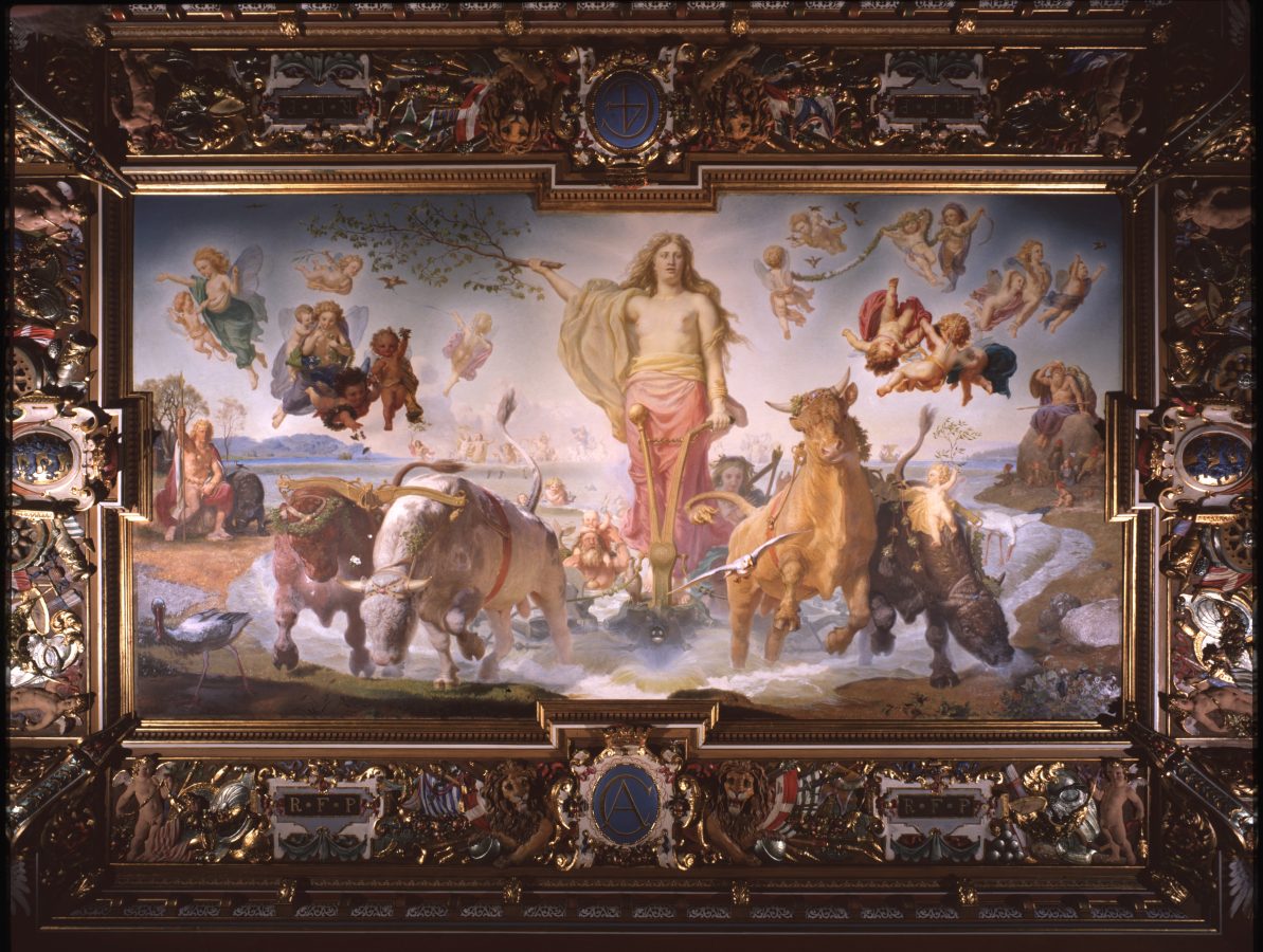 Derefter Lorenz Frølichs loftsmaleri af Gefion, der pløjer Sjælland ud af Sverige.