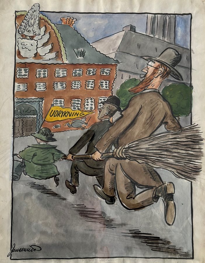 Herunder ses endnu en Jensenius-tegning fra vores store samling. Det er statsminister Stauning, justitsminister Steincke og undervisningsminister Nina Bang, der i 1924 målrettet går mod Kancellibygningen på Slotsholmen for at rydde op. Fra facaden ser Frederik 4. måbende på de tre socialister med kost og spand, der har dannet regering. Og hov – er det ligefrem en heksekost, hun kommer med? Er Danmarks første kvindelige minister nærmest kommet fra Bloksbjerg?