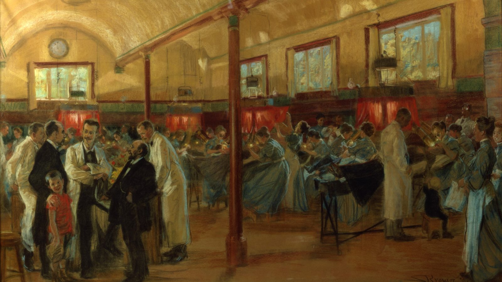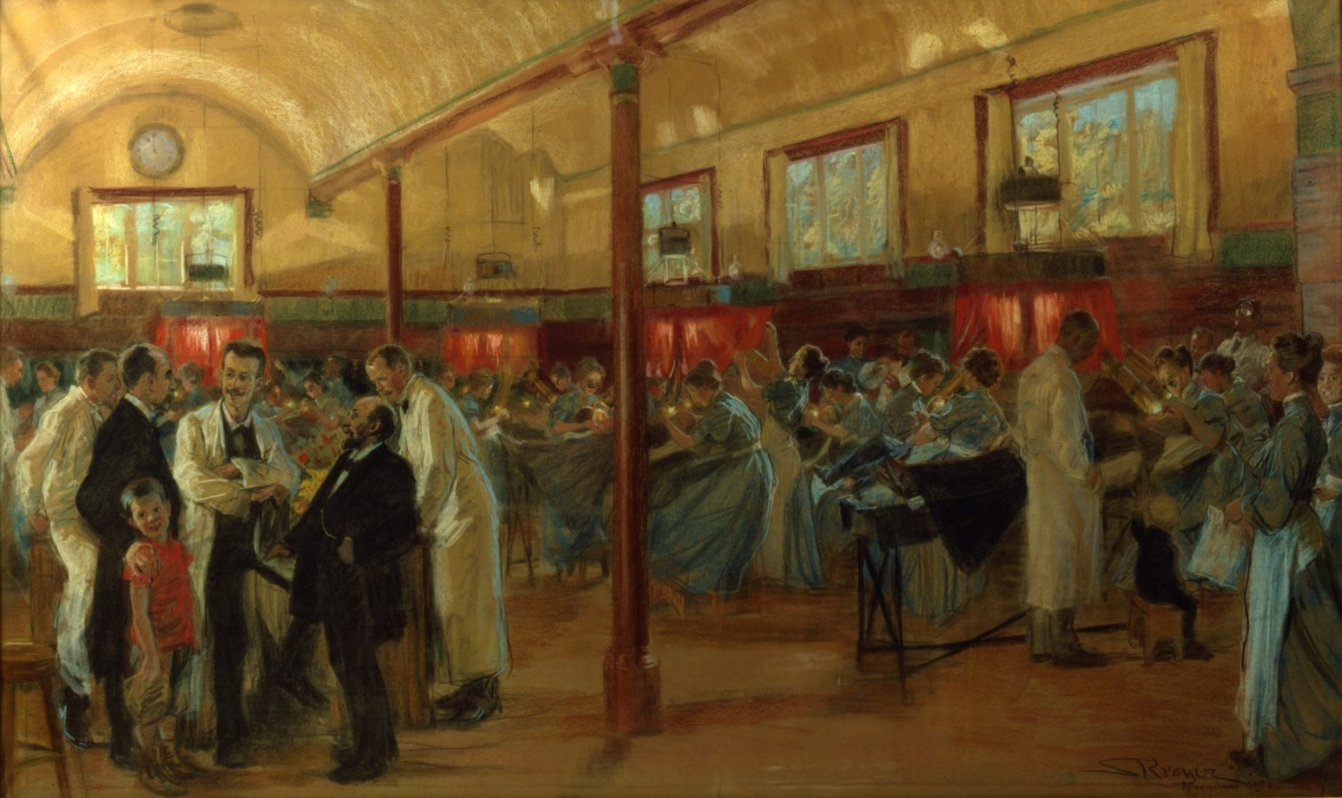 Øverst ses P.S. Krøyers pastel af Finseninstituttets store lyssal. Den er malet i maj-juni 1903, altså et halvt år før, Niels Finsen fik tildelt Nobelprisen i medicin. Den hænger ikke fremme lige nu, da den – paradoksalt nok – er meget ømfindtlig over for lys.