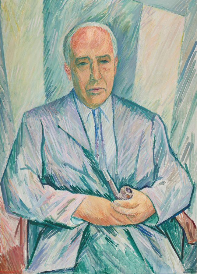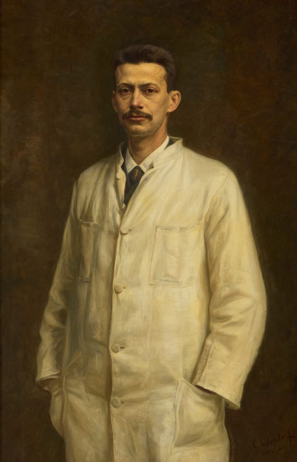 Derunder Carl Wentorfs portræt af Niels Finsen, malet 1904-06, altså efter Finsens død. Det hænger i stue 71 på 3. sal.