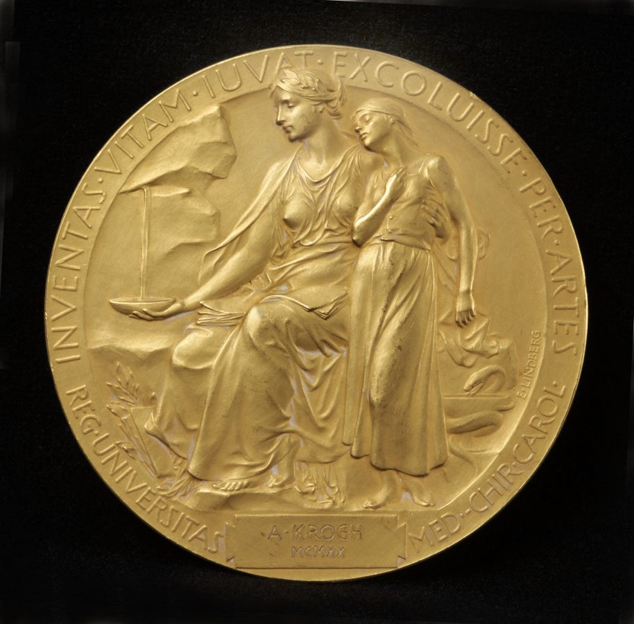 Med til historien hører også August Kroghs Nobelpris og den Nobelmedalje af guld, som vi har liggende her på Frederiksborg. For uden Nobelprisen ville August Krogh ikke være rejst på foredragsturné til USA. Og uden Marie Krogh, som var både dr.med. og diabetiker, ville han ikke være taget til Toronto i Canada for at få opskriften på insulin.