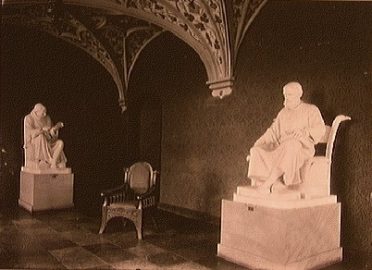 I Valdemarsalen har vi statuer af både Saxo og Snorri Sturluson, de store digtere og historiefortællere. De er lavet af Otto Evens i 1880’erne. Nederst kan du se, hvordan de to statuer var opstillet i museets første år.