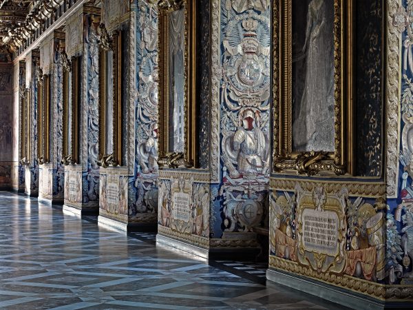 Loftet er udført efter motiver fra Dogepaladset i Venedig. I loftets centrum, svævende over den fornemme sal, ses Frederik 3. på tronen, omgivet af allegoriske figurer, der repræsenterer krig og fred.