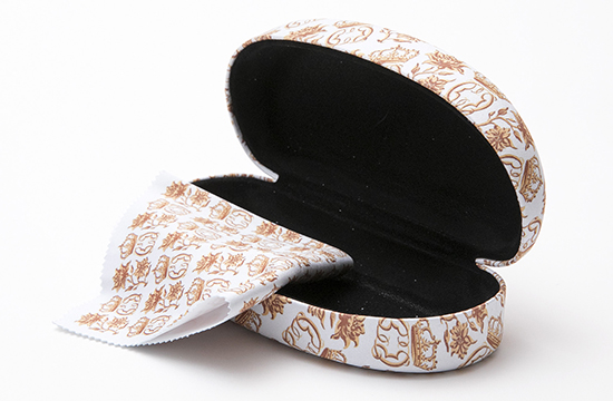Stort og rummeligt brilleetui med tilhørende brilleklud med mønster inspireret af Lambert van Havens originale tegninger til de kongelige tapeter i Kongens Runddel ved Audienssalen på Frederiksborg Slot.