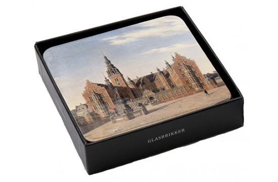 Flaskebrikker med malerier af Frederiksborg Slot som motiv. Hver brik har eget motiv.