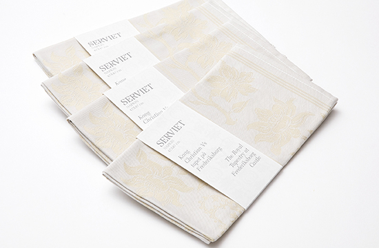 Mundservietter i damask med mønster inspireret af Lambert van Havens originale tegninger til de kongelige tapeter i Kongens Runddel ved Audienssalen på Frederiksborg.
