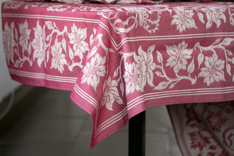 Dug i damask med mønster inspireret af Lambert van Havens originale tegninger til de kongelige tapeter i Kongens Runddel ved Audienssalen på Frederiksborg Slot.